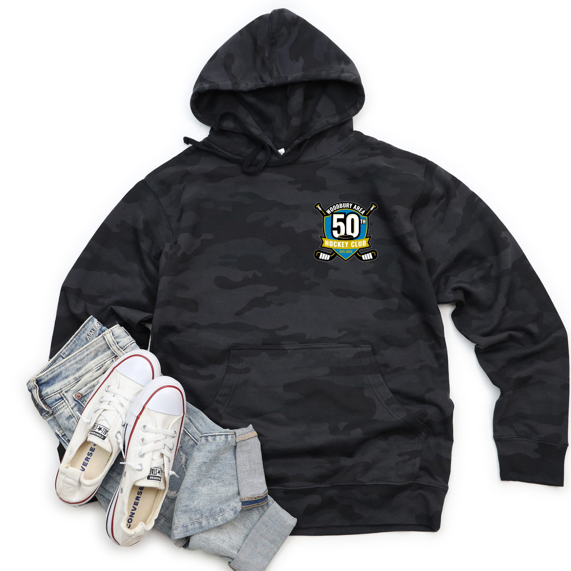 Woodbury 50th Anniversary Hoodie Sweatshirt - Youth - Pocket Design - Black Camo